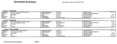 A garnishee summary will print each pay, providing important information relating to each garnishee currently being held against employees on the payroll. (This report will print only if there are garnishees on the payroll.)