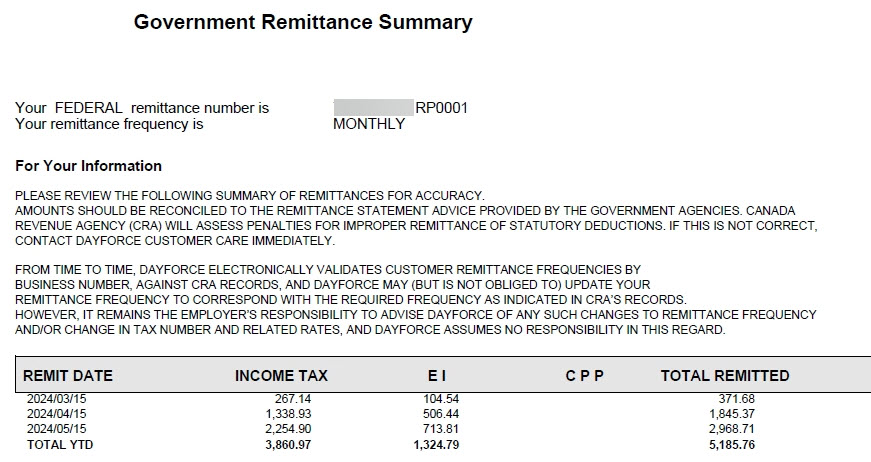 A Government Remittance Summary is included with your reports the first pay run after your assigned remittance dates. This report indicates the payments made on your behalf by Dayforce and should be verified to the monthly statement you receive from Canada Revenue Agency.