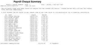 The Payroll Cheque Summary provides a detailed listing of all the employee cheques produced on the current payroll run. It may be used to quickly identify any employees receiving payment by cheque.