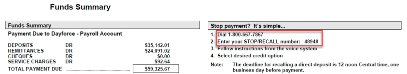The IVR phone number and your Stop/ Recall number appear on the Funds Summary in the Standard Reports Package and on the Payroll Reports Cover Page.