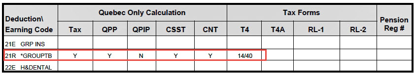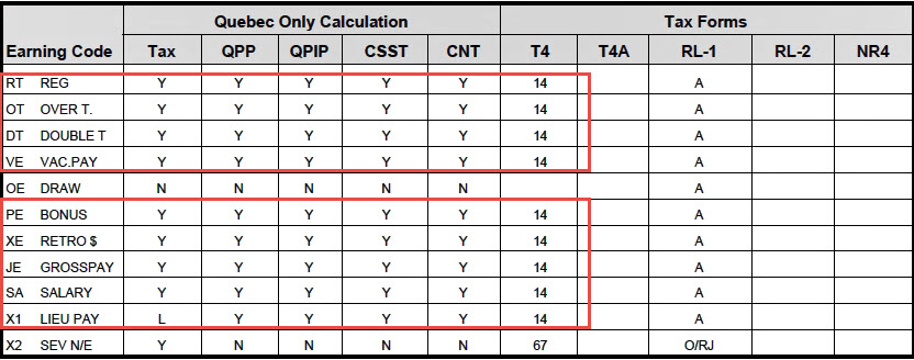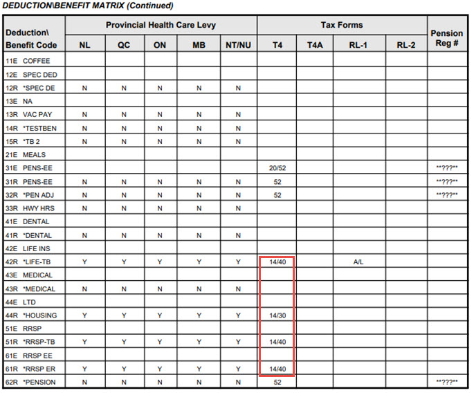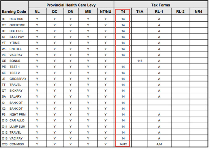 Looking at your Matrix, we took your earnings, deductions and benefits that are being directed to T4 box 14 or 71. Example: we included all the highlighted items below.