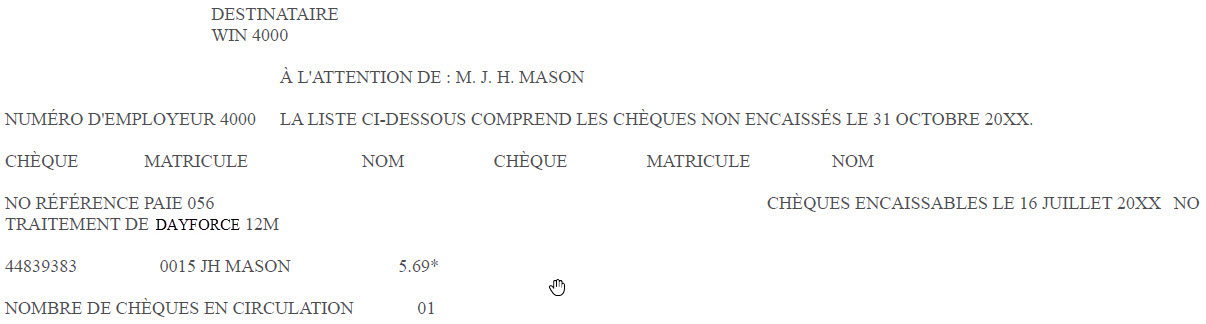 Dans l'exemple ci-dessous, J.H. Mason, matricule 15, n'a toujours pas encaissé un chèque de 5,69 $ en date du 31 octobre 20XX.