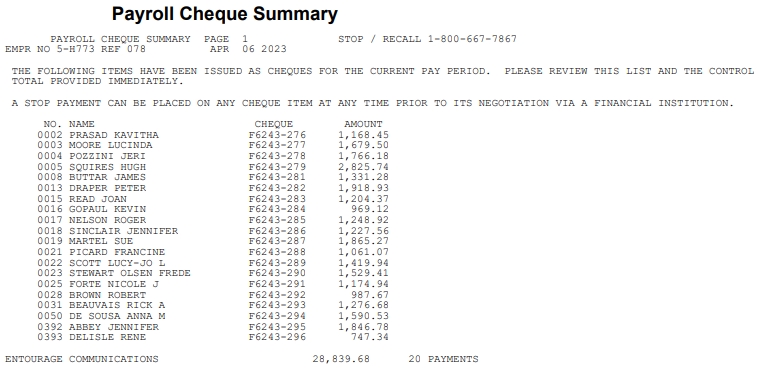 Le rapport Sommaire des chèques de paie dresse la liste de tous les chèques émis aux employés pour la période de paie en cours. On peut l’utiliser pour repérer rapidement les employés qui sont payés par chèque.
