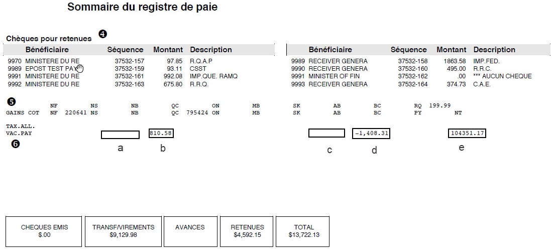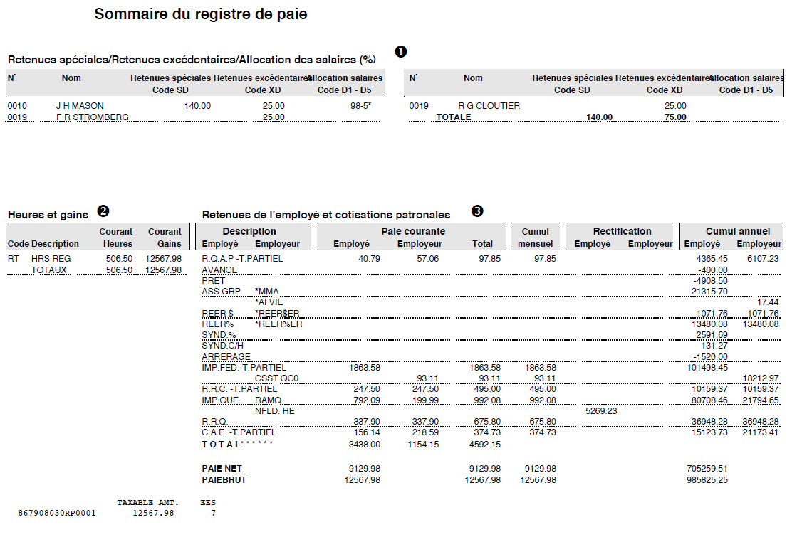 Le Sommaire du registre de paie est formé d'un ensemble de cinq rapports imprimés après le registre de paie.