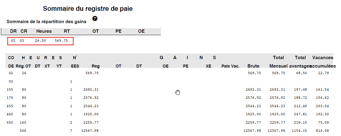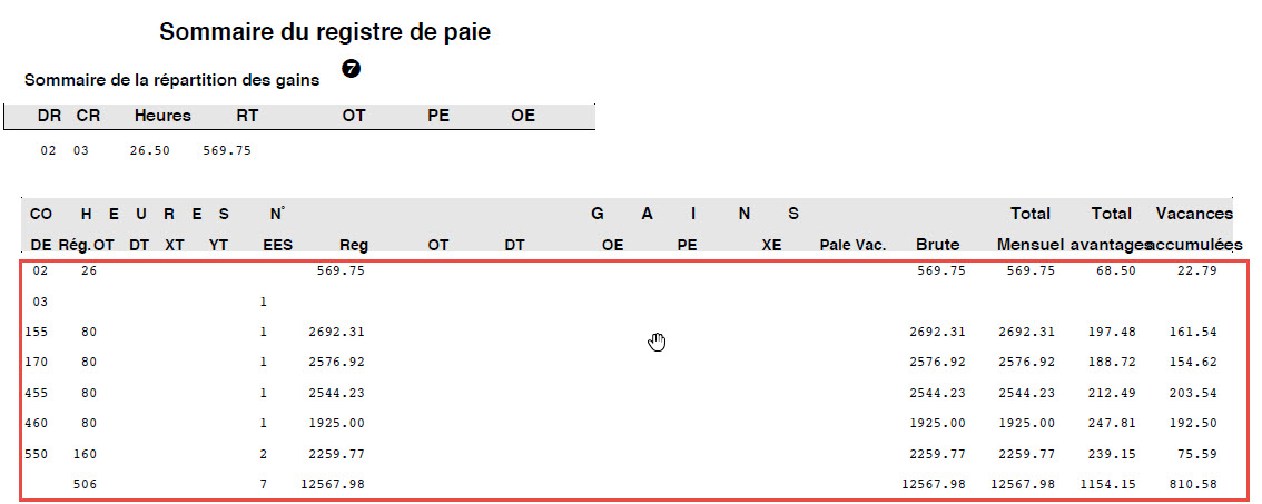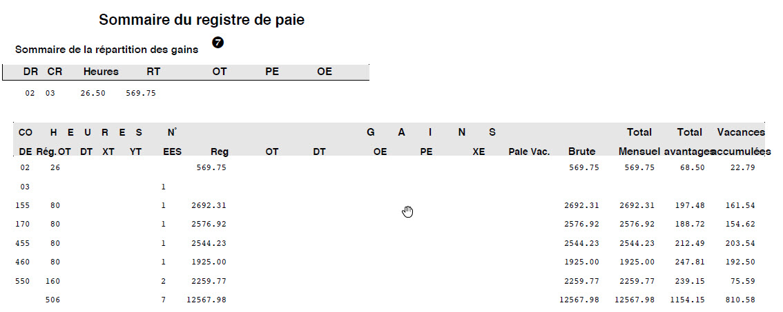 Heures et gains - Ce rapport contient le total des montants liés à tous les codes d'heures et de gains de la liste de paie courante.