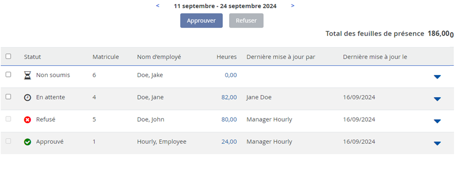 Utilisez les filtres pour effectuer une recherche par employé ou par statut de la feuille de présence (Non soumis, Approuvé, En attente ou Refusé).