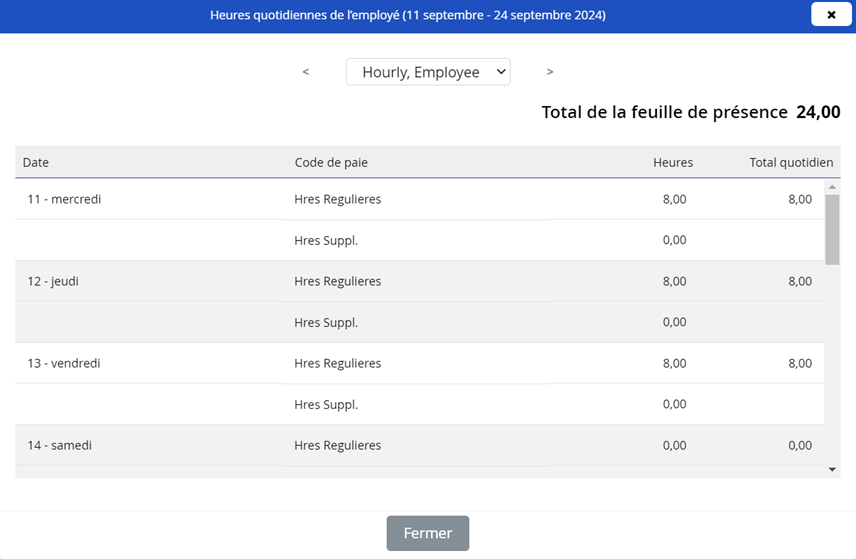 Après avoir examiné les heures de chaque employé, cliquez sur Fermer.
