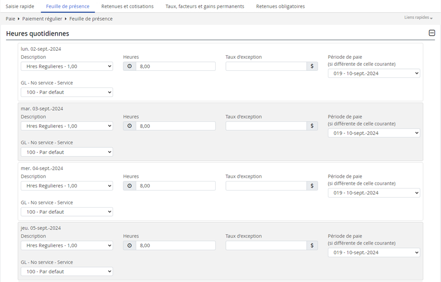 Remarque : La saisie, la modification, l’approbation ou le refus des heures quotidiennes dans l’environnement libre-service peuvent être limités en fonction de l’état de la paie et de la date limite de soumission des modifications (telle qu’elle est définie sur la
