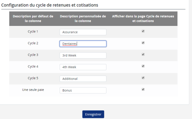 Utilisez pour attribuer des descriptions des colonnes personnalisées afin de remplacer les descriptions de colonnes par défaut, et pour définir quels cycles seront affichés dans la page Cycle de retenues et cotisations.