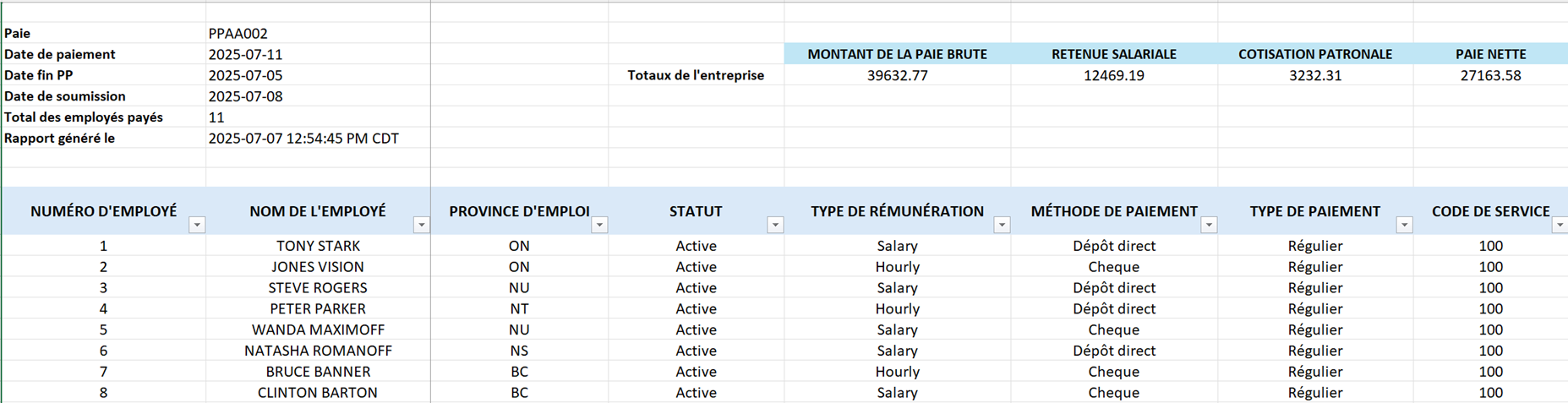 Le rapport Aperçu des résultats de la paie est disponible en format Excel pour les traitements réguliers et supplémentaires.