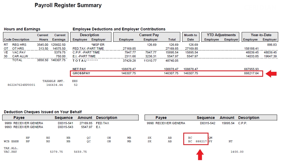Remarque : Le total apparaissant dans le Sommaire du registre de paie pourrait ne pas s’afficher correctement dans le cas des rectifications traitées au cours du dernier trimestre de l’année pour les employés ayant atteint la rémunération assurable maximale au titre de la CAT.