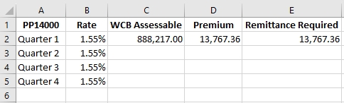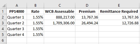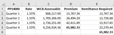 5. Assurez un suivi de vos calculs pour l’année en cours sur une feuille de calcul pour faciliter les calculs futurs, et consignez le montant calculé pour chaque période visée par le rapport. L’exemple présenté s’applique aux employeurs qui effectuent des versements trimestriels.