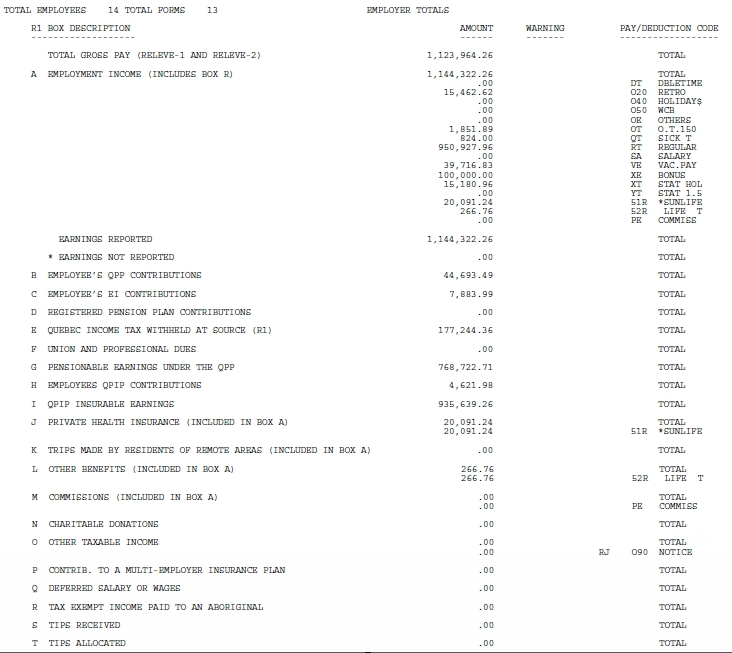 Le salaire brut total comprend l’ensemble des gains versés à l’employé, y compris le revenu de pension et tout autre revenu non déclaré à la case A du relevé 1. Le montant indiqué à la case A ne devrait comprendre que les gains et les avantages imposables qui doivent y être déclarés selon les exigences de Revenu Québec, comme les cotisations à un REER payées par l’employeur.