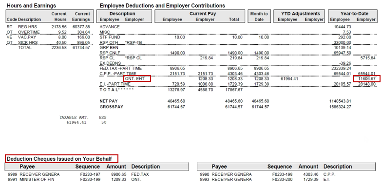 Passez en revue la section Chèques pour retenues. La description ONT apparaît uniquement lorsque Dayforce verse les retenues en votre nom.