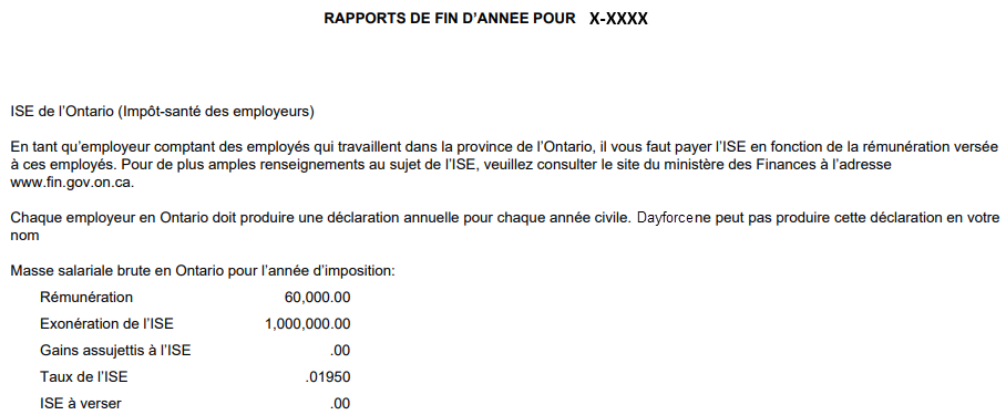 Ce rapport affiche le cumul annuel total de l’employeur au titre de l’ISE de l’Ontario, qui correspond au montant annuel dû.