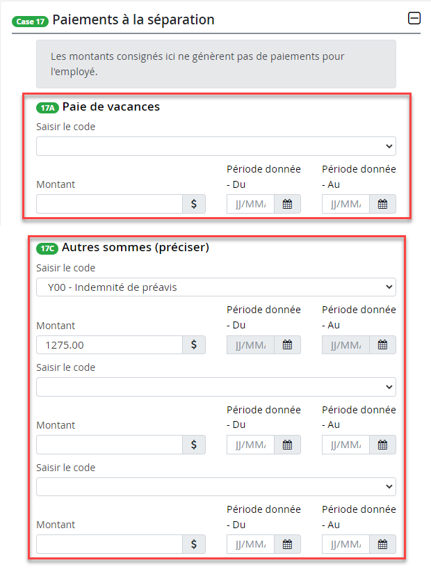 Un montant assurable saisi à la page Changement de statut / RE (et/ou saisi dans la feuille de présence de l’employé ou au moyen de la fonction Saisie rapide) est inscrit à la case 17 du RE. Le montant est égal ou supérieur au montant affiché dans la case Période paie 1 du RE (période de paie en cours). |