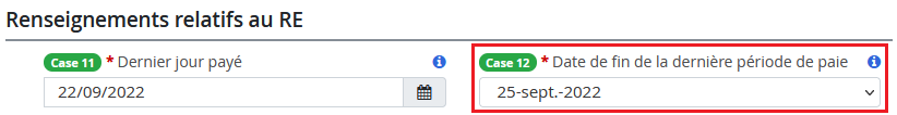 Aucun gain ni heure assurables ne sont associés à la période de paie indiquée par la date du dernier jour payé inscrite à la case 11. Remarque : La première période de paie mentionnée dans le message d’erreur fait référence à la case Période de paie 1 du RE, et non à la première période de paie de l’année. La case Période de paie 1 du RE affiche la date de fin de la période de paie ainsi que les heures et les gains assurables enregistrés pour l’employé au cours de cette période de paie. |