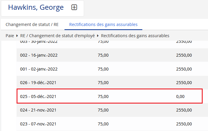 Dans l’historique d’AE et du RQAP (Paie > RE / Changement de statut > Rectifications des gains assurables), il existe une période de paie comprenant des gains assurables où les valeurs des gains et des heures assurables ne correspondent pas, ce qui signifie que l’un est à zéro et que l’autre non. Les heures et les gains assurables doivent soit contenir tous les deux une valeur, soit afficher tous les deux zéro. |