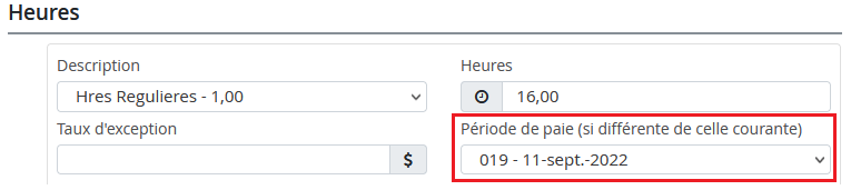 Les heures ou les gains saisis dans la feuille de présence sont attribués à une période de paie différente de celle indiquée à la case 12 du RE. Feuille de présence :