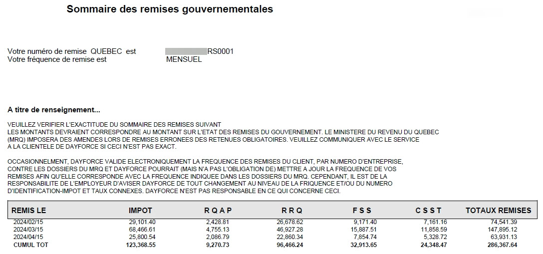Cette information figure dans le Sommaire des remises gouvernementales qui se trouve dans votre Ensemble de rapports standard. Indiquez les montants des retenues d’impôt du Québec, et des cotisations au RRQ, au RQAP et au FSS que vous avez déclarés pour chacune des périodes de paiement de l’année visée.