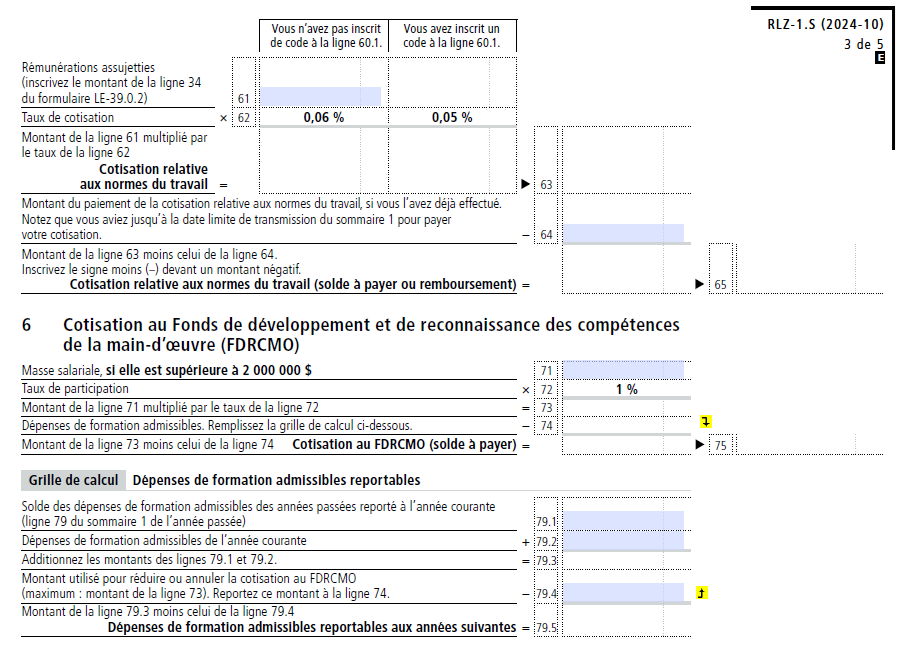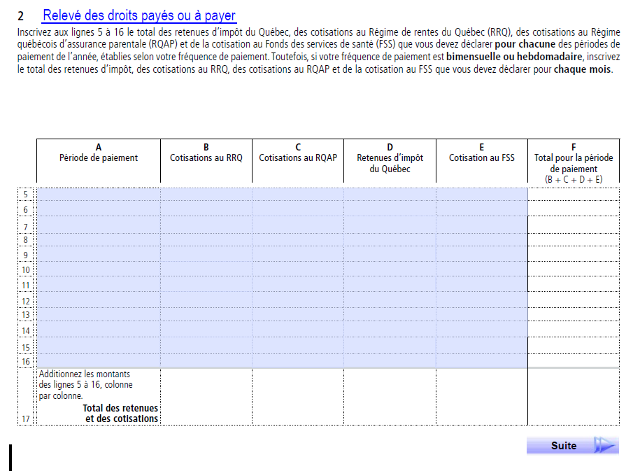 Le SOMMAIRE 1 – Sommaire des retenues et des cotisations de l’employeur applicable à une année d’imposition donnée doit être soumis au plus tard le dernier jour de février de l’année suivante. Par exemple, pour l’année d’imposition 2025, la date limite est le dernier jour de février 2026.