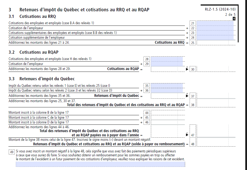 Ligne 21-36 : Entrez les montants applicables des cotisations au RRQ, des cotisations au RQAP et des retenues d’impôt du Québec figurant dans le rapport Sommaire des retenues et des cotisations de l’employeur qui se trouve dans votre Ensemble de formulaires fiscaux.