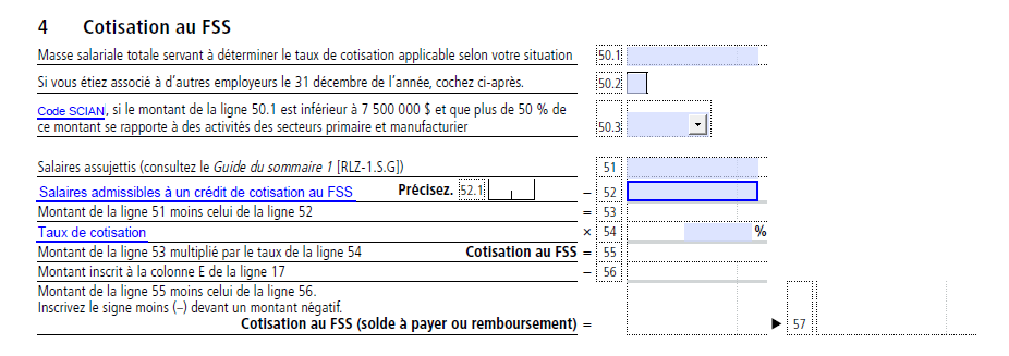 Ligne 50.1 : Masse salariale totale (pour toutes les listes de paie associées). Ce montant est utilisé pour déterminer le taux de cotisation au FSS applicable selon votre situation.
