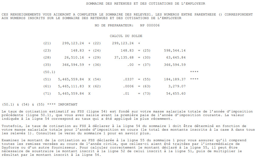 Une valeur n’apparaît dans le rapport Sommaire des retenues et des cotisations de l’employeur qui se trouve dans votre Ensemble de formulaires fiscaux, fourni par Powerpay, que si le montant de votre masse salariale est supérieur à 2 millions $. Si vous avez plusieurs comptes de paie dont la masse salariale combinée est supérieure à 2 millions $, vous devez calculer manuellement la valeur à indiquer à la ligne 71.