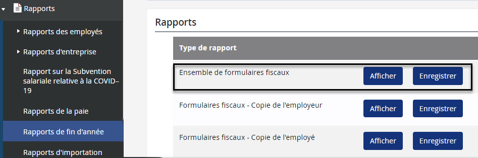 | Rapport de vérification de fin d’année pour le traitement des formulaires fiscaux | Accédez à la | Ensemble de formulaires fiscaux |
